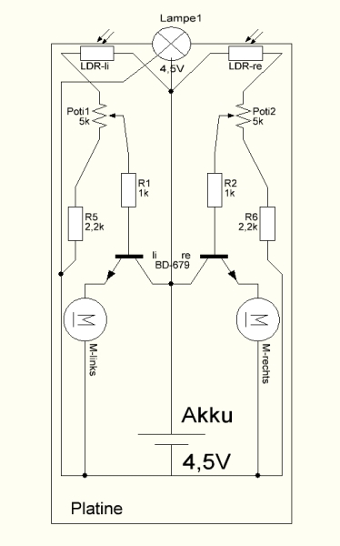 Da ich meine Kenntnisse in der Elektronik dringend aufbessern muss, wird dieser einfache Bot (es ist diemal noch kein Droide) gänzlich ohne mC gebaut, sondern besteht rein aus konventioneller Elektronik. Das dies möglich ist, zeigen diverse Forumthreads zu schon erreichten Projekten und einige PDF-Anleitungen die ich zusammengesucht habe. Folglich bekommt der Bot auch seinen passenden Namen: OmC-Bot ("Ohne-mikro-Controller-Bot"). ...