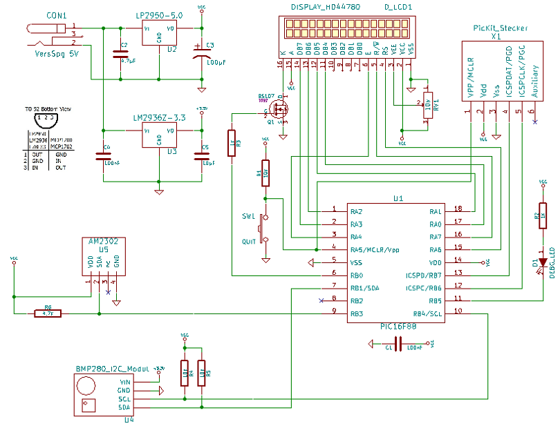 Dann kam der BMP280 an die Reihe. Der Bosch Sensor ist ganz schön unhandlich in der Auswertung. Um die Werte für die Temperatur und barometrischen Druck zu erhalten, sind ganz schön viele 32bit Berechnungen durchzuführen, s. Anhang BME280_swI2C.c und .h. Damit waren die 4k Flashspeicher des PIC schon ziemlich gut gefüllt. Um Programmspeicher zu sparen und mächtige Bibliotheksfunktionen wie Stringfunktionen oder itoa zu vermeiden entstand eine kleine LCD Ausgaberoutine für Fixkomma ZahlenwerteZum Glück ist der DHT22 mit einem relativ simplen Protokoll einfach auszulesen. Die DHT22 Auswertung braucht nur wenig Programmspeicher.Code:/* write int val to display with fixed dec position and sign * nWidth must be big enough for decimal and sign width due to value range */ void FixCommavalToDisp(int val, char nWidth, char nDec){ char disptext[9]; int tmpval = val; if (tmpval < 0) tmpval = -tmpval; // Text von rechts füllen disptext[nWidth] = 0; // '/0' Terminierung // Nachkommastellen if(nDec){ while((nDec) && (nWidth)){ disptext[--nWidth] = int_to_char(&tmpval); nDec--; } // Dezimalpunkt if(nWidth) disptext[--nWidth] = '.'; } // Vorkommastellen while(nWidth){ disptext[--nWidth] = int_to_char(&tmpval); if((tmpval == 0) && (nWidth)){ if (val < 0) disptext[--nWidth] = '-'; // Vorzeichen break; } } // führende Leerzeichen auffüllen while(nWidth) { disptext[--nWidth] = ' '; } // LCD Ausgabe putsLCD(disptext); return; } char int_to_char(int *val){ char c = (*val % 10) + '0'; *val /= 10; return c; }