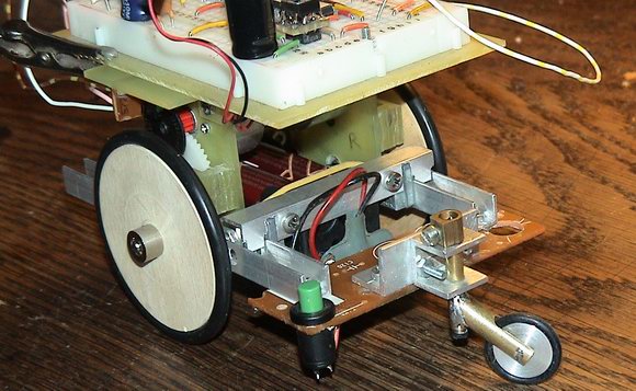 So langsam möchte ich das Gerät mal fahren lassen. Dazu möchte ich die Elektronik auf einem kleinen Steckbrett unterbringen. Hab aber die Befürchtung, daß es da etwas eng wird. Da sollen die Quadraturencoder HW-Schaltung mit zwei ICs, ein µC, Fernsteuer IR-Empfänger und noch H-Brücken drauf