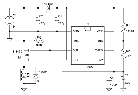 Heraus gekommen ist eine Schaltung mit einem TLC555, einem P-Kanal FET und einem 9V NiMh Akku. Der "Elektromagnet" ist irgendeine Spule aus einem Schaltnetzteil, 100µH und unter einem Ohm Gleichstromwiderstand. Ich war zu bequem selbst eine Spule zu wickeln und habe alles mögliche ausprobiert und war überrascht, daß diese Spule in der Ausrichtung zum Geschwindigkeitssensor wie im Foto links unten zu sehen, so zuverlässig funktioniert. In der Optimierung des Elektromagneten steckt wahrscheinlich das größte Verbesserungspotential. Wenn der FET einschaltet, bricht durch den geringen Spulenwiderstand die Batteriespannung gnadenlos von zB 9,4V auf unter 3V ein. Ohne Unterstützung des 9V Blocks durch C2 mit 470µF schaltet der Reedkontakt im Sensor nur unzuverlässig. Nach der Diode 1N4148 bleibt durch C1 die Versorgung des TLC555 auch während des Schaltens sehr schön stabil.
