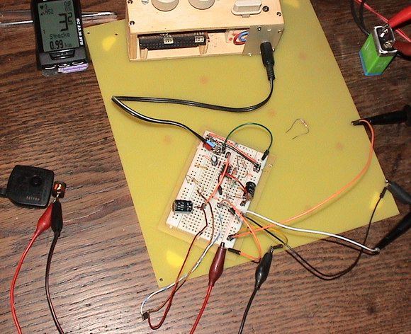 Grundidee: Geschwindigkeitssensor und Fahrradcomputer vom Rad trennen und zum Joggen mitnehmen. Reedkontakt im Geschwindigkeitssensor mit Elektromagnet betätigen, so daß Aufzeichnung der Herzfrequenz (kommt von Brustband) im Fahrradcomputer stattfinden kann. Und zusammen mit den Höhenmessdaten könnte man dann später eventuell feststellen, daß es bergauf doch mehr pumpt als bergab