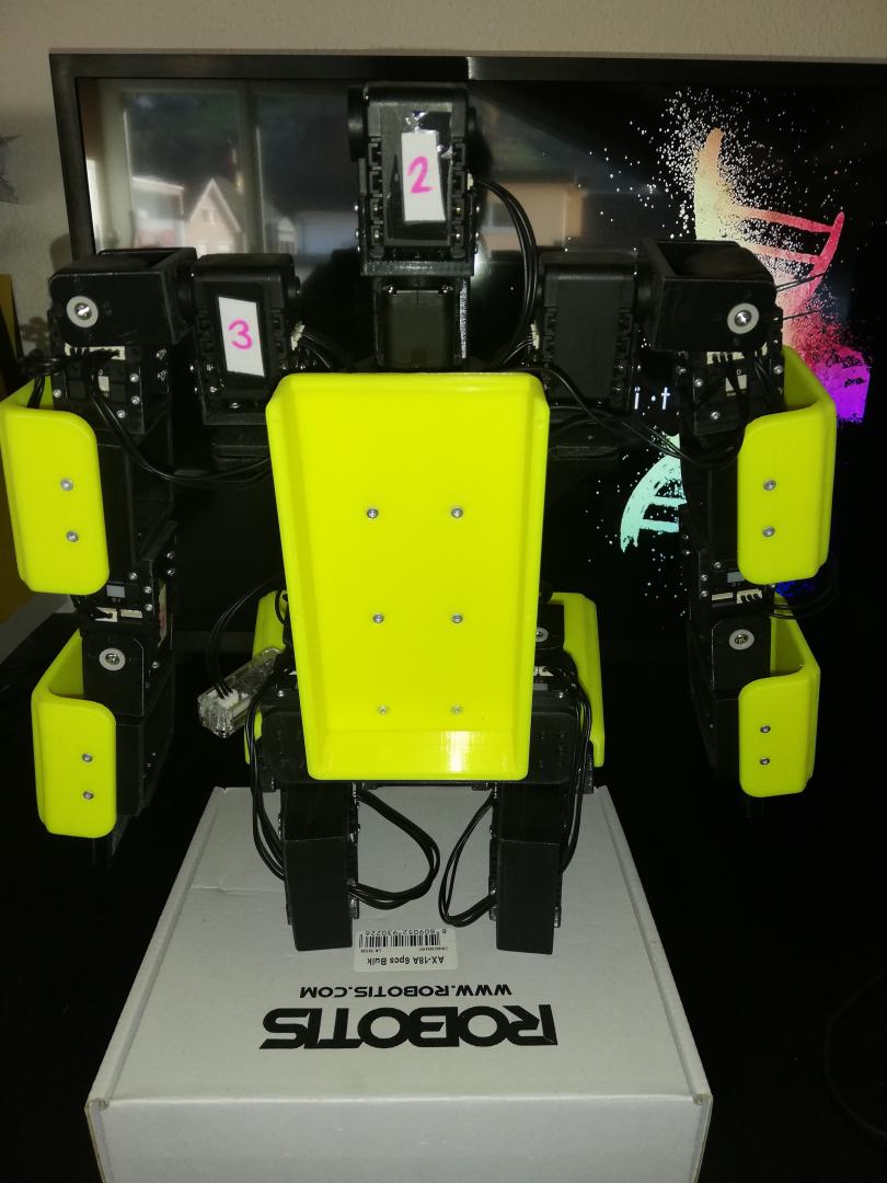 Für die Herstellung der Verbindungselemente besorgte ich mich einen 3D Drucker. Die 20 Servomotoren die ich verbaut habe sind aus dem Hause Robotis vom Typ Dynamixel AX-12A.