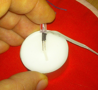 Die 4 LEDs sind so auf Kabelchen aufgelötet (und mit Schrumpfschlauch fixiert), dass sie in ein Teelicht gesteckt werden können. Die Platine mit Batterie wird natürlich unter Tannenzweigen versteckt