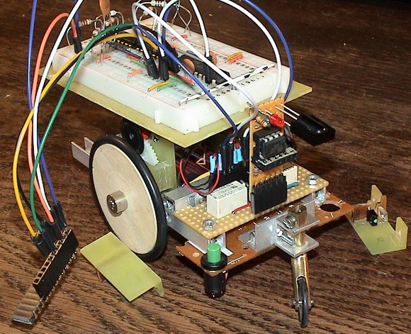 Auf dem Steckbrett ist die Vorauswertung der Quadratursignale von beiden Radencodern und der ATtiny861A, der mit internem Oszillator und PLL mit 16MHz laufen kann, schon verkabelt. Bleiben noch die Radencoderoptik anzuschrauben und zu verkabeln. Das Programm kann dann in großen Teilen vom TT übernommen und angepaßt werden.