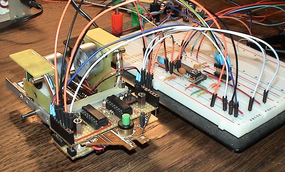Im Augenblick überlege ich, ob ich nicht doch von einem ATtiny861 auf einen ATMega88 umsteige. Auf dem Steckbrett läuft der ATMega mit einem 16MHz Keramik Resonator und hat einen HW-Multiplizierer und noch viele Pins frei. Schließlich muß vorne auf das Vehikel auch noch was drauf und wenn es zunächst nur Scheinwerfer werden würden